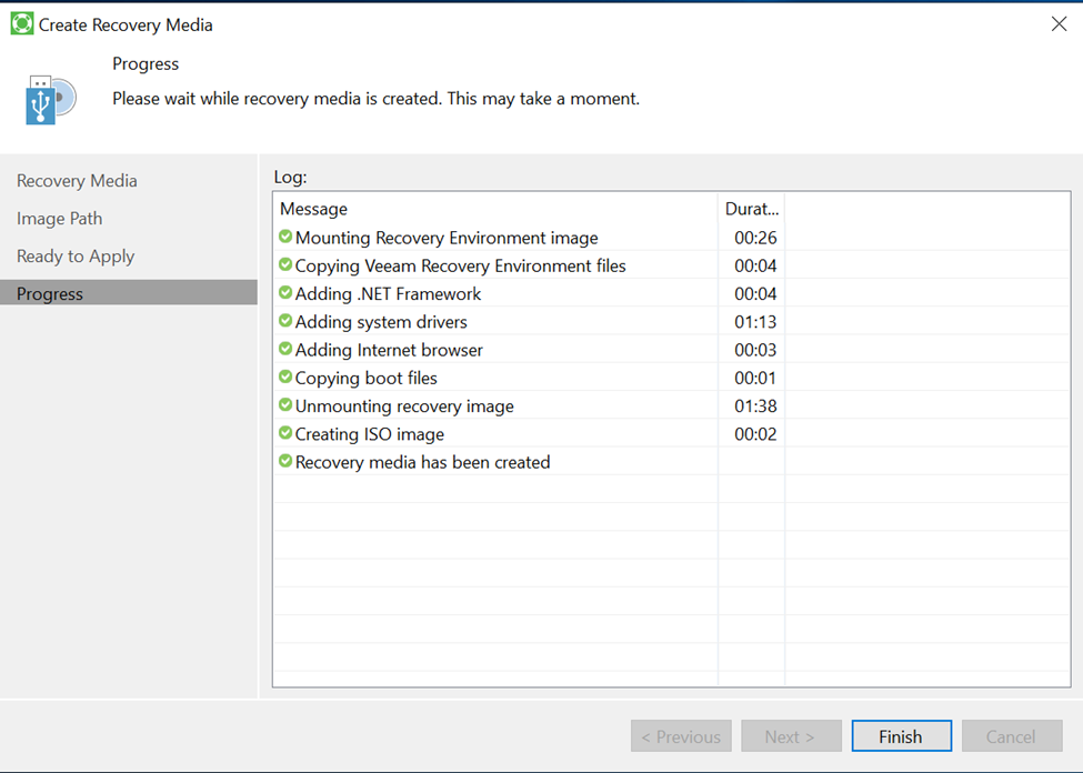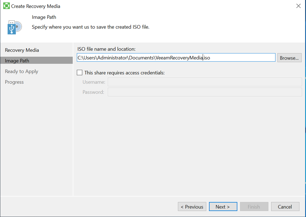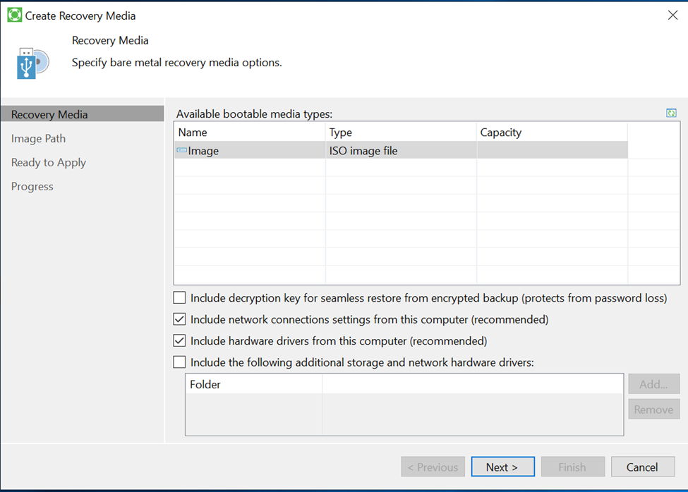 Bước 1: Khởi động ứng dụng Create Recovery Media. file Bước 2: Cửa sổ hiện ra, tùy chọn các kết nối mạng, driver mà bạn muốn tích hợp vào file Veeam Recovery Media sau đó bấm Next để tiếp tục. file Bước 3: Đặt tên và chọn nơi lưu trữ file ISO. Sau đó bấm Next để tiếp tục.