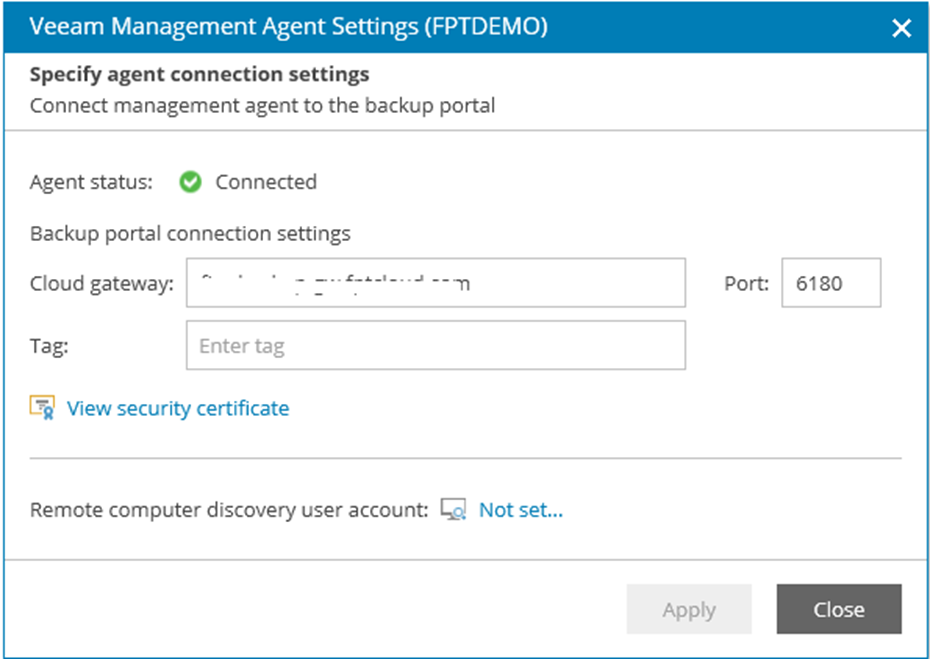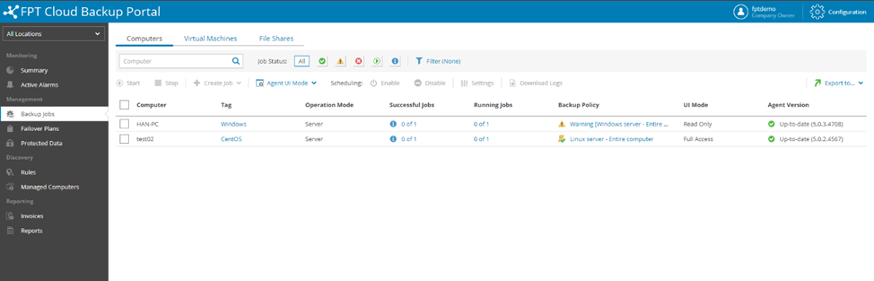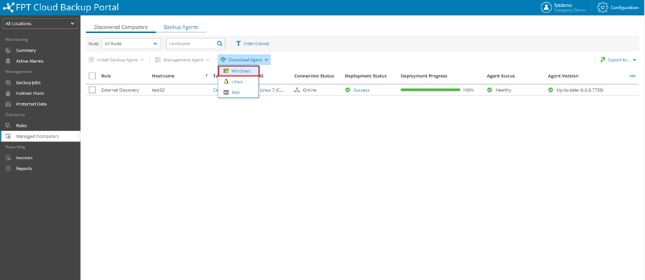Bước 1 : Trên server cần backup, login vào trang portal với account của bạn: Backup as a Service : https://baas.fptcloud.com file Đây là giao diện quản trị của bạn sau khi login thành công: file Bước 2 : Vào mục Managed Computers chọn Download Agent sau đó chọn Window. file Chỉnh thời gian Token hết hạn theo nhu cầu. Mặc định là 12 Tháng. file Bước 3: Sau khi download thành công ta tiến hành cài đặt Management Agent trên server cần backup: file Chọn Next để tiếp tục: file Chấp nhận điều khoản sau đó bấm Cloud Gateway: baas-sgn-gw.fptcloud.com hoặc baas-han-gw.fptcloud.com Port: 6180 file Bước 5: Kiểm tra VM xuất hiện trên portal và tiến trình cài đặt Veeam Agent thành công. file Bước 6: Kiểm tra Job backup xuất hiện trên portal và Veeam Agent For Windows đã được cài đặt trên Server. file file