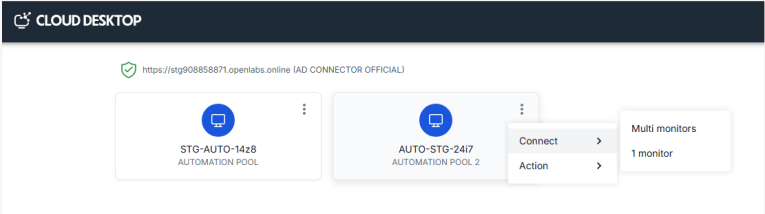 3.Truy cập vào máy ảo Tại màn hình danh sách các máy ảo, chọn truy cập vào máy ảo mong muốn. Lưu ý: tại bước này người dùng chọn option truy cập qua FCDClient.