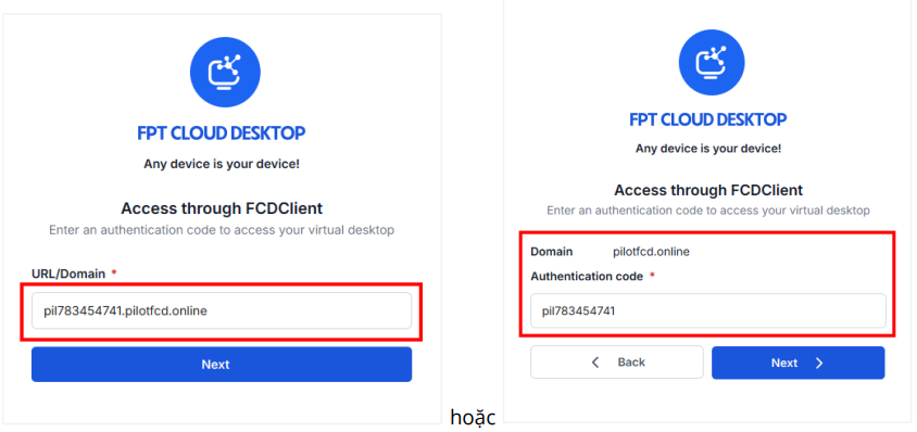 - URL đã chứa authentication code hợp lệ (định dạng code.domain). Ví dụ: pil783454741.pilotfcd.online
