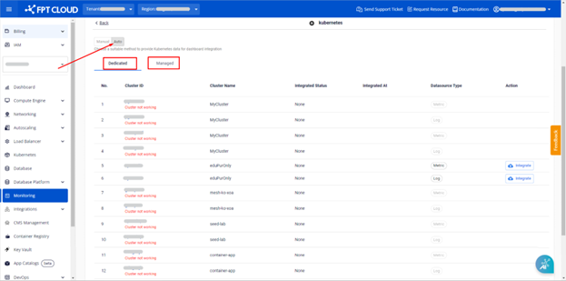 1, Click tab Dedicated Alt text 2, Chọn cụm cluster và loại datasource bạn muốn tích hợp. Mỗi cụm cluster sẽ có 2 loại datasource là metric và log. Chỉ những cụm cluster đang hoạt động và datasource ở trạng thái active thì người dùng mới có thể tích hợp. 3, Click Integrate Alt text Xuất hiện hộp thoại xác nhận người dùng có muốn tích hợp logs/metrics của cluster lên workspace tương ứng hay không. Để xác nhận, người dùng click button Confirm. Alt text Sau khi click, trạng thái tích hợp là Integrating. Alt text Người dùng đợi 1-2 phút hệ thống sẽ tự động cập nhật lại trạng thái cuối cùng (thành công hoặc thất bại). Alt text 4, Tiếp đến, người dùng đăng nhập vào trang Dashboard bằng cách chọn tab Configuration > Click vào link Dashboard URL và đăng nhập bằng username, password được hiển thị. Alt text 5, Sau khi truy cập vào trang Dashboard, người dùng click Home > chọn Dashboard > chọn Folder Fmon – Kubernetes và sử dụng. Alt text