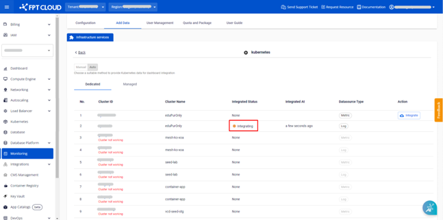 Bước 1 : Đăng nhập vào FPT portal cloud https://console.fptcloud.com Bước 2 : Trên menu của FPT Cloud Portal, click Monitoring. Bước 3 : Click chi tiết vào một Workspace, sau đó di chuyển tới Add Data tab. Bước 4 : Trong tab Infrastructure services , hiển thị danh sách các dịch vụ infrastructure đang sẵn có, click vào một dịch vụ bạn muốn monitor. Alt text Bước 5. Click Manual và sau đó làm theo hướng dẫn. Alt text Ngoài ra, FPT Monitoring hỗ trợ tích hợp tự động Kubernetes DedicatedKubernetes Managed. Việc tích hợp này giúp người dùng có thể cấu hình tích hợp theo dõi metric và log của từng cụm cluster dễ dàng và chuyên nghiệp. Để sử dụng tính năng này, người dùng thao tác như sau: Bước 1 : Trong tab Infrastructure service , click Kubernetes Alt text Bước 2 : Click Auto. Tại đây, hiển thị bảng danh sách các cụm cluster DedicatedManaged. Alt text Lưu ý: Trong trường hợp người dùng chưa có cụm cluster nào hiển thị, người dùng vào phần Kubernetes trên menu, click Create a Kubernetes Engine để tạo. Hướng dẫn chi tiết khởi tạo Kubernetes người dùng có thể tham khảo tại link sau: https://fptcloud.com/documents/managed-fpt-kubernetes-engine/ https://fptcloud.com/documents/dedicated-fpt-kubernetes-engine/ Nếu tenant của bạn không có quyền tạo, hãy liên hệ với đội ngũ admin của chúng tôi để hỗ trợ.