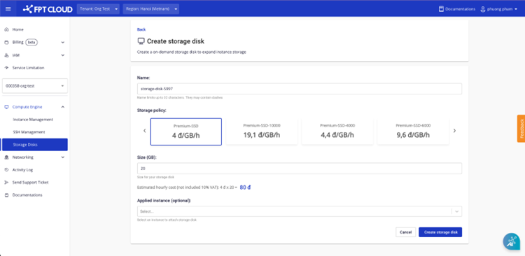 - Hệ thống sẽ trừ tiền chi phí sử dụng storage trong 1h ngay khi khởi tạo.