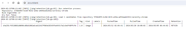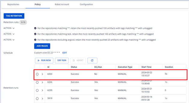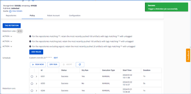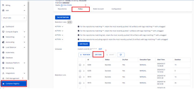 Người dùng có thể quản lý danh sách các Retention Run đã chạy quy tắc. Ngoài ra người dùng có thể chạy thủ công các quy tắc, chạy DRY RUN để kiểm tra cấu hình quy tắc, ABORT một retentions đang chạy, xem chi tiết mỗi lần chạy quy tắc và logs đã chạy. 1. Chạy các quy tắc thử công với RUN NOW Để thực hiện chạy quy tắc, người dùng có thể thực hiện như sau: Bước 1 : Tại menu FPT Portal > Container Registry > Policy > RUN NOW Bước 2 : Click OK để confirm chạy Retentions: Bước 3 : Kết quả sau khi chạy Retention 2. Chạy Retention với DRY RUN Bước 1 : Tại menu FPT Portal > Container Registry > Policy > DRY RUN Bước 2 : Kết quả sau khi chạy DRY RUN Khác với chạy RUN NOW, DRY RUN sẽ không thực sự xoá các images trên repository 3. Abort một Retention Run Người dùng có thể Abot một Retention đang Running thực hiện như sau: Bước 1 : Tại menu FPT Portal > Container Registry > Policy > click retentions đang Running > ABORT Bước 2 : Click OK để confirm hành động Abort Bước 3 : Kết quả sau khi thực hiện Abort 4. Xem danh sách các retention run Bước 1 : Tại menu FPT Portal > Container Registry > Policy 5. Xem logs một retention run Bước 1 : Tại menu FPT Portal > Container Registry > Policy > Click vào một Retention run để xem chi tiết một task run Bước 2 : Kiểm tra logs chạy retentions run cho một repository: