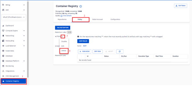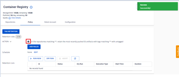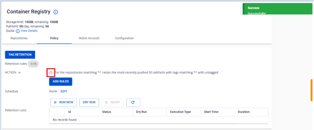 FPT Cloud hỗ trợ người dùng quản lý các Tag Retention Rule đã được tạo bao gồm Edit enable/disable/delete. 1. Cập nhật một Tag Retention Rule đã tạo Trường hợp người dùng cần thay đổi một retentions rule đã tạo, có thể thực hiện như sau: Bước 1 : Tại menu FPT Portal > Container Registry > Policy > Chọn Tag Retention Rule muốn cập nhật > Actions > Edit : Bước 2 : Thực hiện cập nhật thông tin cấu hình retention rule: Trong hộp thoại Edit, cho phép người dùng thay đổi cấu hình của một tag retention rule tương tự việc tạo mới một retentions. Ví dụ người dùng có thể thay đổi các repo được áp dụng quy tắc, hoặc thay đổi số lượng artifact được giữ lại, …. Bước 3 : Kết quả sau khi cập nhật một retentions: Ví dụ: **For the repositories matching **** **** , **retain the most recently pushed 50 artifacts with tags matching **** **** with untagged: Người dùng vừa thực hiện thay đổi số lượng artifact được giữ lại từ 20 lên 50 artifacts 2. Disable một Tag Retention Rule Người dùng muốn Disable một Tag Retention Rule đang được cấu hình trong repository có thể thực hiện như sau: Bước 1 : Tại menu FPT Portal > Container Registry > Policy > Chọn Tag Retention Rule muốn cập nhật > Actions > Disable : Bước 2 : Kết quả sau khi disable tag retention rule: 3. Enable Tag Retention Rule đã disable Người dùng muốn Enable một Tag Retention Rule đang được cấu hình trong repository có thể thực hiện như sau: Bước 1 : Tại menu FPT Portal > Container Registry > Policy > Chọn Tag Retention Rule muốn cập nhật > Actions > Enable : Bước 2 : Kết quả sau khi enable Tag Retention Rule 4. Delete Tag Retention Rule Người dùng muốn Delete một Tag Retention Rule đang được cấu hình trong repository có thể thực hiện như sau: Bước 1 : Tại menu FPT Portal > Container Registry > Policy > Chọn Tag Retention Rule muốn cập nhật > Actions > Delete : Bước 2 : Kết quả sau khi delete Tag Retention Rule: