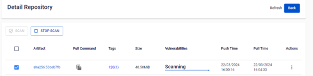 Bước 1 : Tại menu FPT Portal > Chọn Container Registry > Repository > Detail Repository Bước 2 : Tích chọn Artifact muốn scan để hiển thị button SCAN Bước 3 : Click SCAN để thực hiện scan images Bước 4 : Kết quả sau khi scan
