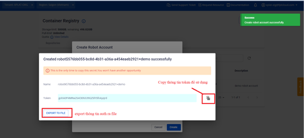 Bước 3 : Kết quả sau khi tạo một Robot account sẽ xuất hiện một hộp thoại cung cấp thông tin Username/Token để truy cập. Tại hộp thoại này sẽ cho phép copy token/ Export to File để lưu thông tin truy cập. Lưu ý : Để đảm bảo an toàn bảo mật thông tin Username/Token chỉ hiển thị một lần duy nhất. Người dùng cần lưu ở nơi an toàn. Kết quả sau khi tạo thành công robot account:
