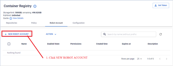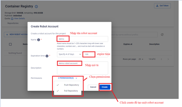 Để tạo mới một Robot Account , bạn cần thực hiện các thao tác sau: Bước 1 : Trên menu FPT Portal chọn Container Registry. Chọn tab Robot Account Bước 2 : Chọn NEW ROBOT ACCOUNT. Nhập thông tin để khởi tạo một Robot Account Trong đó: