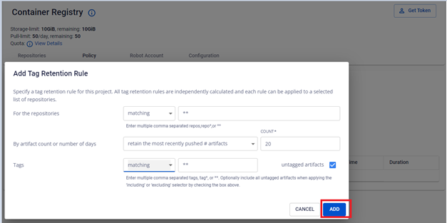 Một phần tag name với ký tự đại diện Ví dụ: ** để áp dụng quy tắc cho tất cả các tag trong FPT Container Registry mà người dùng quản lý Nếu lựa chọn matching , quy tắc sẽ được áp dụng cho tất cả các tag mà bạn xác định. Ngược lại nếu lựa chọn excluding , quy tắc sẽ được áp dụng cho tất cả các tag trong repository ngoại trừ những tag mà bạn xác định Bước 8 : Click Add để lưu lại quy tắc Bước 9 : Kết quả Tag Retention Rule được tạo: Ví dụ retention rule: **For the repositories matching **** **** , **retain the most recently pushed 20 artifacts with tags matching **** **** with untagged: Đối với các repositories, giữ lại 20 artifacts được push gần nhất với tất cả các tag