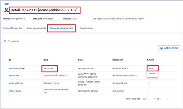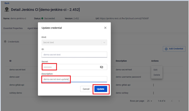 Bước 2. Tại màn Credential Managements > Chọn credential loại Secret Text cần Edit > Actions Edit : Bước 3. Thực hiện chỉnh sửa các thông tin: Bước 4. Kết quả sau khi cập nhật thông tin
