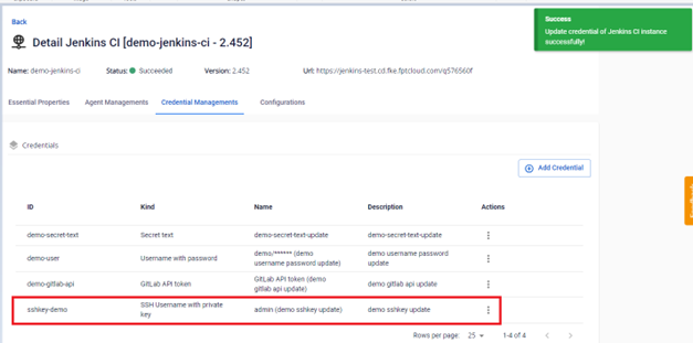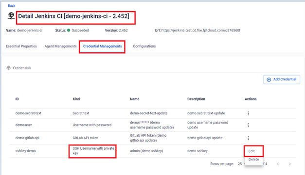 Bước 2. Tại màn Credential Managements > Chọn credential loại SSH Username with private key cần Edit > Actions Edit : Bước 3. Thực hiện chỉnh sửa các thông tin: Bước 4. Kết quả sau khi cập nhật thông tin