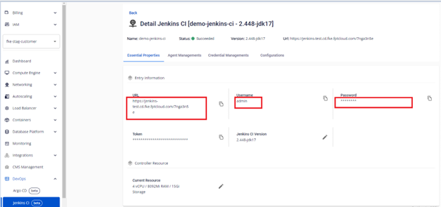 Để đang nhập vào hệ thống, người dùng có thể sử dụng user/password đã được tạo trên portal như sau: Bước 1. Tại menu FPT Portal > DevOps > Jenkins CI > Click Instance Name để xem thông tin chi tiết của cụm: Tại màn hình đầu tiên, bạn sẽ được cung cấp thông tin chi tiết để truy cập Jenkins CI instance bao gồm url, username/password đăng nhập: Bước 2. Đăng nhập vào Jenkins instance: Tại màn hình Essential Properties > Thực hiện copy url và truy cập vào ứng dụng: