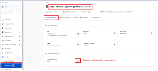 Khi số lượng jobs trên Jenkins chạy vượt quá tài nguyên được dùng để chạy ứng dụng, người dùng có nhu cầu tăng tài nguyên cho cụm Jenkins Controller đang chạy có thể thực hiện chọn các gói tài nguyên đã được cung cấp bởi FPT Cloud như sau: Bước 1. Vào menu Essential Properties > Instance Information Bước 2. Chọn gói tài nguyên muốn nâng cấp: Lưu ý: Hệ thống chỉ cho phép update lên gói dịch vụ cao hơn, không hỗ trợ downgrade resource *Bước 3. Kết quả sau khi update resource: