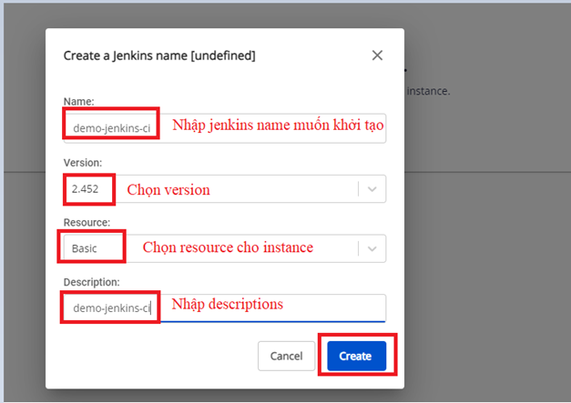 Để tạo mới Jenkins CI instance , bạn có thể thực hiện các thao tác sau: Bước 1. Trên menu của FPT Portal > DevOps > Jenkins CI > Click Create a Jenkins Bước 2. Nhấn chọn Create a Jenkins > Nhập thông tin để khởi tạo một Jenkins CI instance: Bước 3. Chọn Create , hệ thống sẽ khởi tạo một cụm Jenkins Instance và thông báo tình trạng xử lý. Sau khi tạo thành công một Jenkins instance, trạng thái của cụm sẽ chuyển sang Successed , khi đó người dùng có thể truy cập vào Jenkins instance thông qua url và account/password đã được khởi tạo.