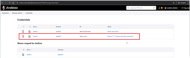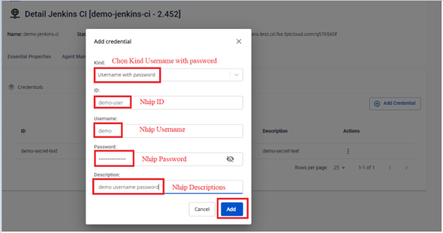 Bước 2. Tại màn hình Credential Managements > Add Credential , thực hiện thêm mới một credential loại Username with password : Bước 3. Nhập thông tin để tạo credential với kind Username with password : Bước 4. Nhấn Add để tạo một credential với kind Username with password. Kết quả sau khi tạo credential: Kết quả tạo credential dưới Jenkins instance: