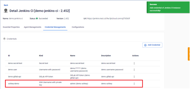 Bước 2. Tại màn hình Credential Managements > Add Credential , thực hiện thêm mới một credential loại SSH Username with private key : Bước 3. Nhập thông tin để tạo credential với kind SSH Username with private key : Bước 4. Nhấn Add để tạo một credential với kind SSH Username with private key. Kết quả sau khi tạo credential: Kết quả tạo credential dưới Jenkins instance: