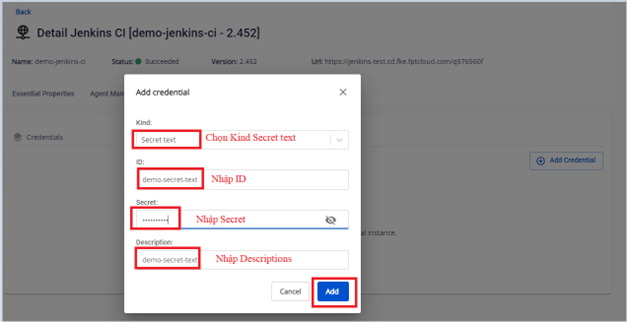 Bước 2. Tại màn hình Credential Managements > Add Credential , thực hiện thêm mới một credential loại Secret Text : Bước 3. Nhập thông tin để tạo credential với kind Secret Text: Bước 4. Nhấn Add để tạo một credential với kind Secret Text. Kết quả sau khi tạo credential: Kết quả tạo credential dưới Jenkins instance:
