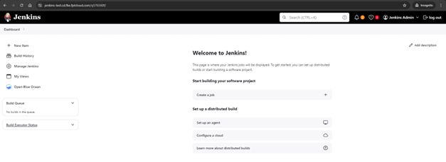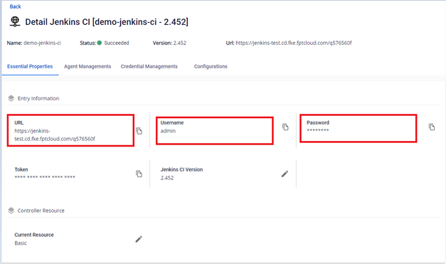 Để làm việc với cụm Jenkins đã được khởi tạo, đầu tiên bạn vào xem thông tin chi tiết của cụm đã được khởi tạo. Bước 1 : Tại menu FPT Portal > DevOps > Jenkins CI > Click Instance Name để xem thông tin chi tiết của cụm: Tại màn hình đầu tiên, bạn sẽ được cung cấp thông tin chi tiết để truy cập Jenkins CI instance bao gồm url, username/password đăng nhập: Bước 2 : Đăng nhập vào Jenkins Instance : Tại màn hình Essential Properties > Thực hiện copy url và truy cập vào ứng dụng: Giao diện sau khi đăng nhập thành công vào Jenkins instance: