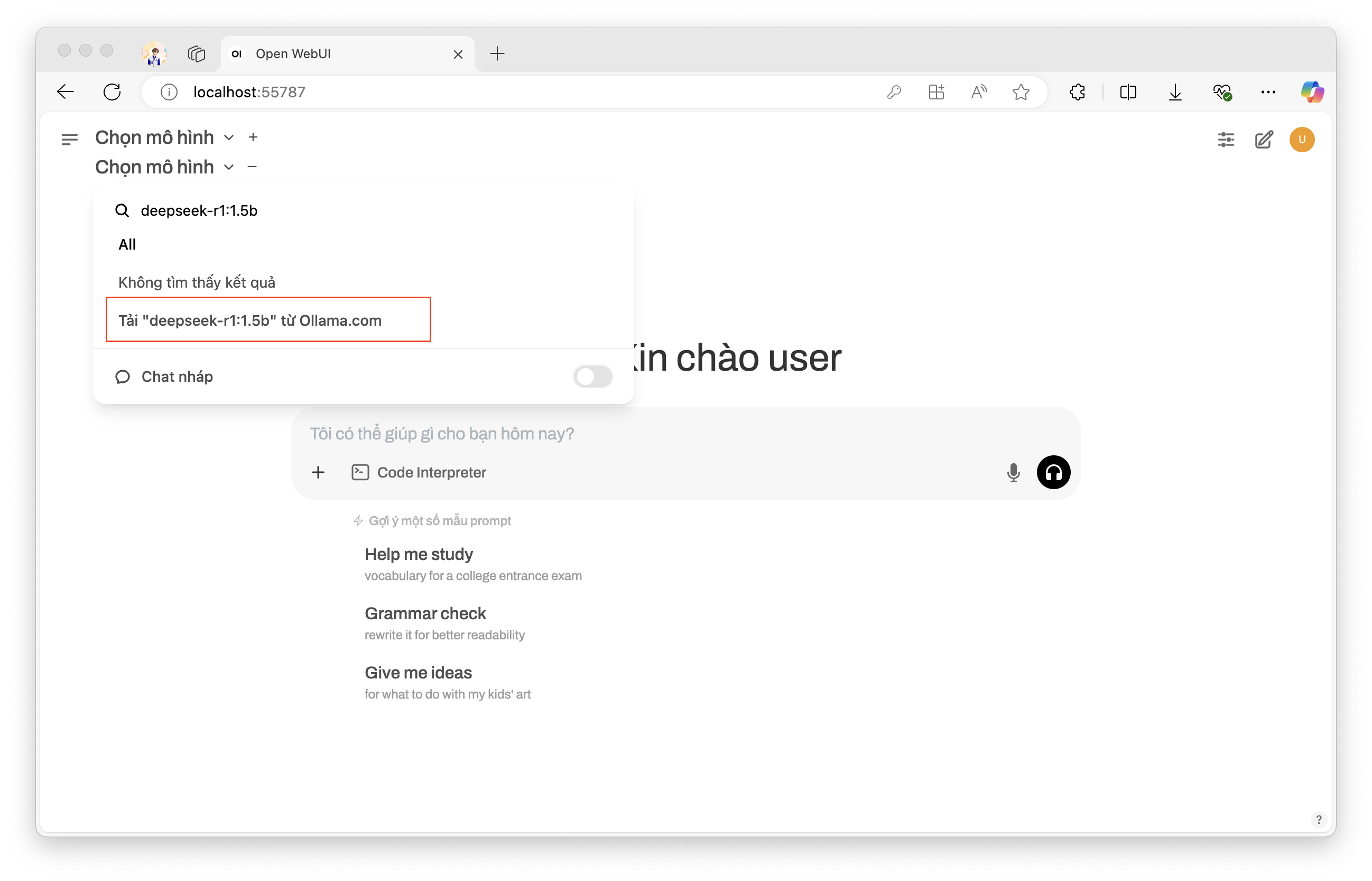 Bước 3 : Truy cập vào open-webui trên trình duyệt tại port đã được forward, ví dụ: http://localhost:52433. Với lần đầu tiên cài đặt và sử dụng OpenWebUI, người dùng sẽ cần cấu hình các thông tin: tên, email, mật khẩu. Bước 4 : Sau khi cài đặt xong, người dùng lựa chọn model để sử dụng. Ví dụ ở đây, ta sẽ cài đặt mô hình DeepSeek-R1, phiên bản 1.5b. Bước 5 : Sau khi mô hình đã được tải và chạy, người dùng có thể tương tác với mô hình rất đơn giản và trực quan thông qua giao diện.
