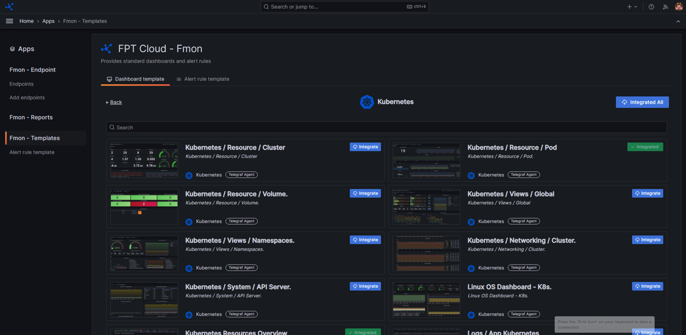Người dùng cần tích hợp các Dashboard Template phù hợp với từng dịch vụ để theo dõi thông tin monitoring.