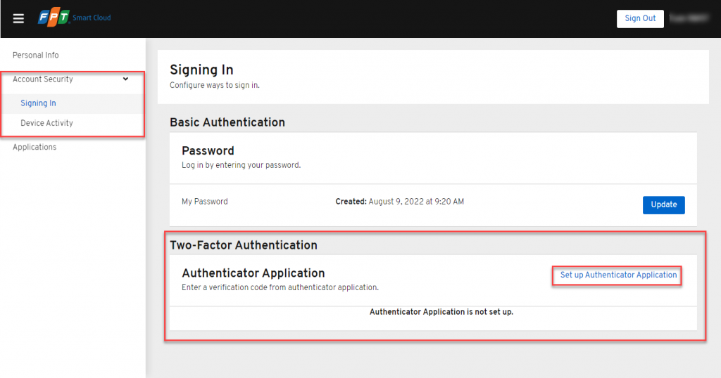 2FA (Two Factor Authentication) là một phương thức xác thực tài khoản an toàn hơn bằng cách tạo thêm một lớp bảo mật nữa ngoài mật khẩu. Tài khoản của người dùng chỉ có thể đăng nhập thành công vào hệ thống nếu đáp ứng được cả 2 bước xác thực này. Để bật tính năng xác thực 2 bước, bạn thao tác như sau: Bước 1 : Nhấn vào vùng hiển thị tên tài khoản ở góc trên bên phải FPT Portal > Chọn Account Security. Bước 2 : Ở mục Two Factor Authentication chọnSet up Authenticator Application. Bước 3: Cài đặt 2FA lên thiết bị di động theo hướng dẫn ở trangMobile Authenticator Setup và chọn Submit. Sau khi cấu hình 2FA thành công, mỗi lần đăng nhập bạn đều sẽ được yêu cầu nhập thêm OTP tạo bởi app 2FA.