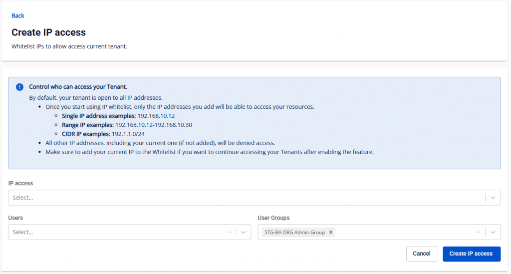 • IP Access: Có thể chọn 1 hoặc nhiều IP, dãy IP hoặc CIDR IP