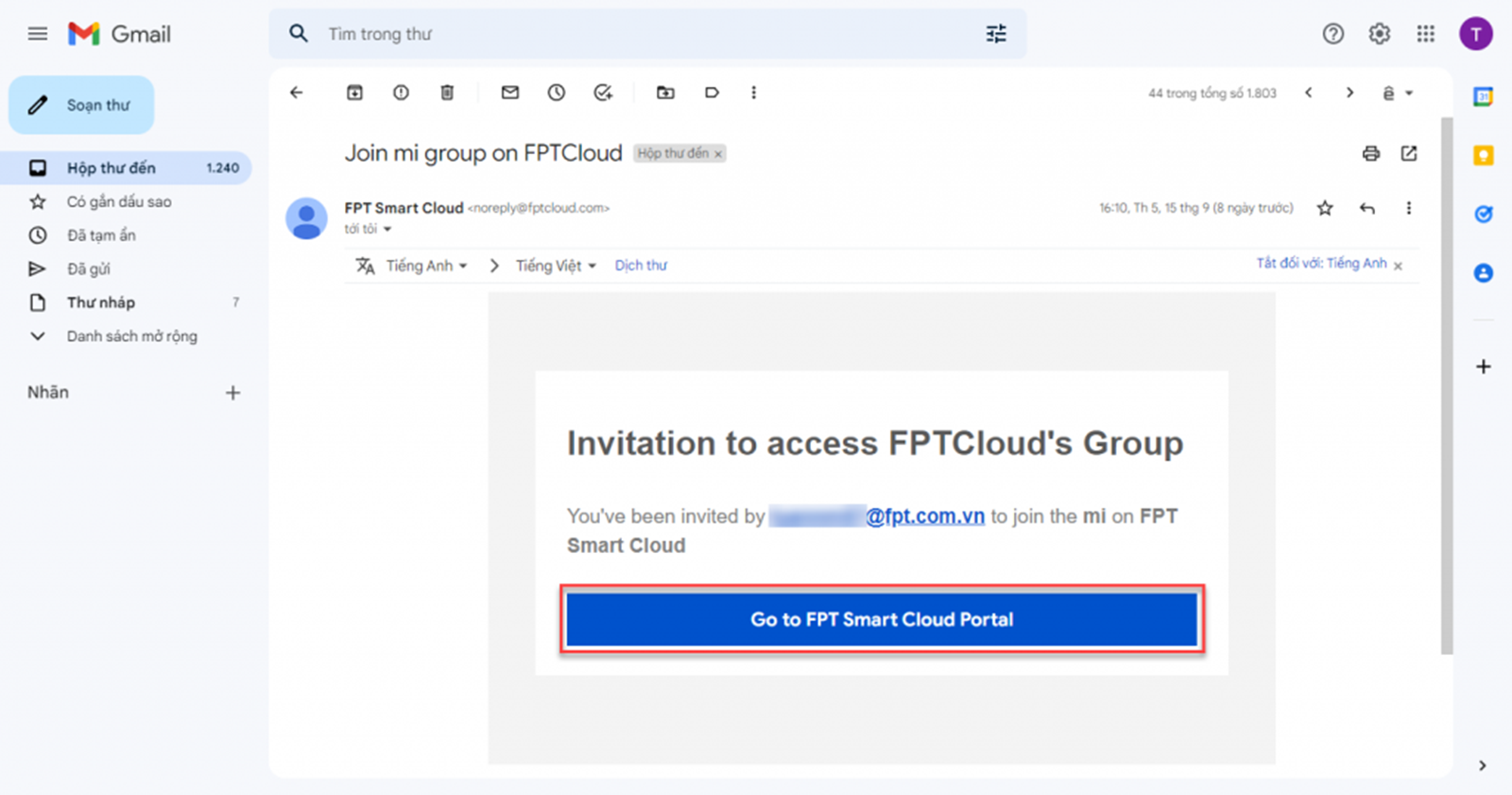 Sau khi Tenant owner gửi lời mời tham gia sử dụng trên FPT Cloud Portal, hệ thống sẽ gửi một email xác nhận đến địa chỉ email đã khai báo trước đó. Người dùng được invite cần mở email và tiến hành xác nhận lời mời để kích hoạt tài khoản.