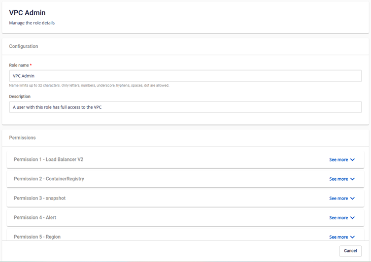 iamXem chi tiết RoleXem Chi Tiet Role Bước 1 : Ở menu chọn IAM > Roles , hệ thống sẽ hiển thị trang Role Management. Bước 2 : Chọn role cần xem thông tin trên danh sách. Hệ thống sẽ hiển thị các thông tin Name, Description, danh sách Permissions của role.