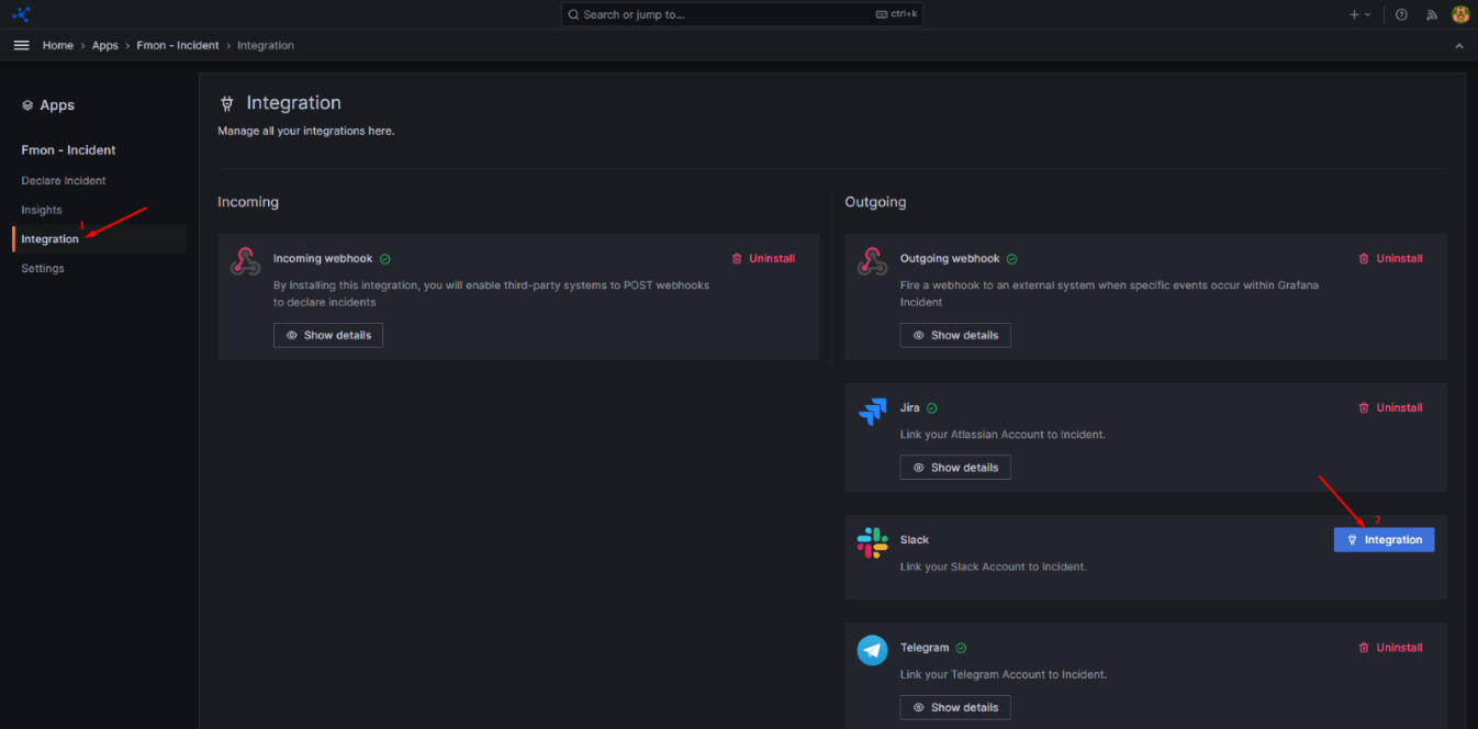 Tích hợp Slack giúp bạn nhận thông báo một cách tự động ngay khi có sự cố được khai báo. Để có thể tích hợp Slack với Incident, bạn cần có Webhook URL. Note: Theo dõi cách lấy Webhook URL tại đây: LINK Sau khi đã có Webhook URL, bạn quay trở lại trang danh sách Incident Management và làm theo hướng dẫn sau đây: Bước 1: Trên menu của Incident Management, click Integration => Vào phần Slack , click Integration Alt text Bước 2: Click Show details > Click “Run when an event firesBước 3 : Người dùng điền Name, URL Alt text Trong đó: