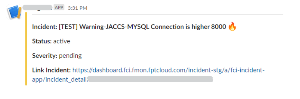 Bước 4: Click Add event action để hoàn tất. Bạn cũng có thể tạo nhiều trigger bằng cách tiếp tục click “Run when an event fires ” để tạo 1 trigger mới. Sau khi thực hiện xong, khi người dùng khai báo một incident mới, hệ thống sẽ tự động gửi thông báo vào kênh chanel trên slack mà bạn đã liên kết kèm theo link incident tương ứng. Ví dụ như sau: Alt text Xóa trigger Người dùng có thể xóa trigger khi không có nhu cầu sử dụng. Bước 1: Click Integration > Show details Bước 2: Click vào icon Trash của trigger bạn muốn xóa Alt text Bước 3: Xuất hiện hộp thoại xác nhận, chọn Yes để xóa.