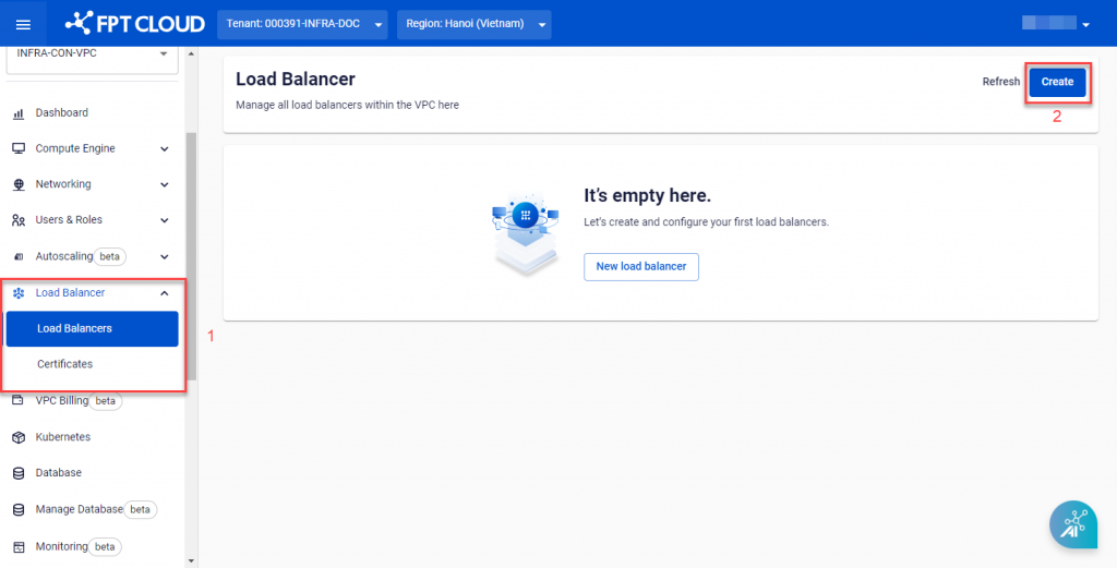 Bước 1 : Truy cập trang Load Balancer Management , chọn Creat. Một hộp thoại mới sẽ hiện lên và hướng dẫn người dùng các bước tiếp theo. Bước 2 : Cấu hình Load Balancer theo nhu cầu với các lựa chọn sau:
