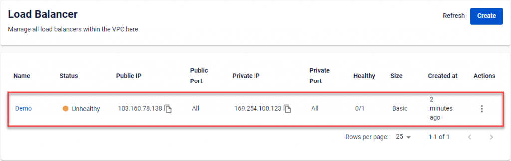 Sau khi khởi tạo thành công, người dùng có thể thấy Load Balancer mới tạo và trạng thái hoạt động trên bảng quản trị.