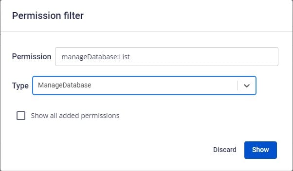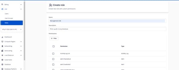 1. Tạo Roles Bước 1 : Vào tab IAM trên Portal > Chọn Roles > bấm Create Role Bước 2 : Hiển thị màn hình Create role > nhập thông tin Name, Description theo nhu cầu người dùng. Bước 3 : Chọn Filter > xuất hiện pop up Permission filter > nhập giá trị Permission ( Giá trị thuộc type manageDatabase, vd: manageDatabase:List), chọn Type ManageDatabase (theo list) > bấm Show. Lưu ý : Với bước Filter này, người dùng có thể không nhập Permission, mà chỉ chọn Type hệ thống sẽ hiển thị toàn bộ giá trị quyền của ManageDatabase Bước 4 : Người dùng tích chọn hoặc không tích chọn các permission thuộc ManageDatabase cần phân quyền > bấm Create role. Tạo thành công một role với trạng thái Active