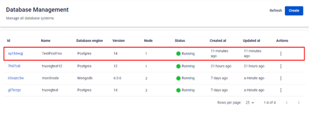 Bước 1: Menu > Database Platform > Relational Database/ Non-Relational Database/ Search Engines/ Data Streaming/ Time Series Db > chọn một ID Cluster có trạng thái Running.