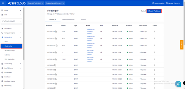 Bước 3: Kiểm tra thông tin địa chỉ IP vừa tạo Allocate: Menu > Networking > Floating IPs > kiểm tra thông tin Ip public có trạng thái Active.
