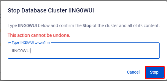 • Xuất hiện popup Stop Database Cluster ID , quý khách nhập lại Cluster ID để xác nhận lại, bấm Stop.