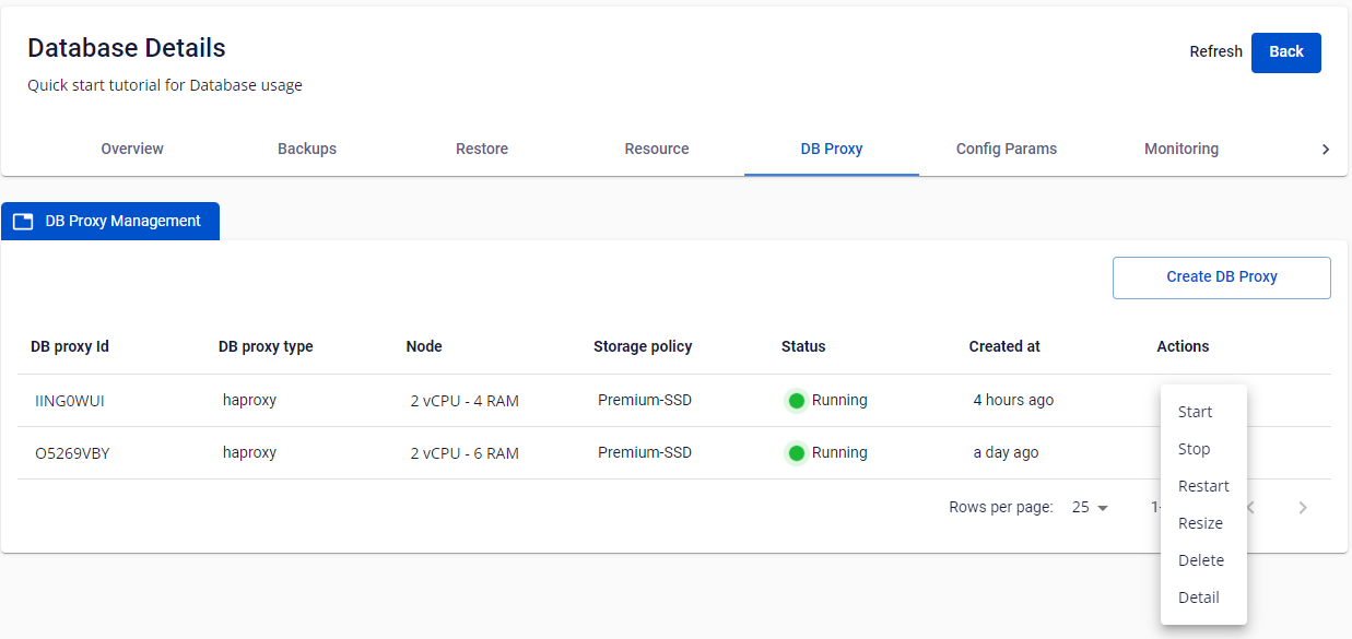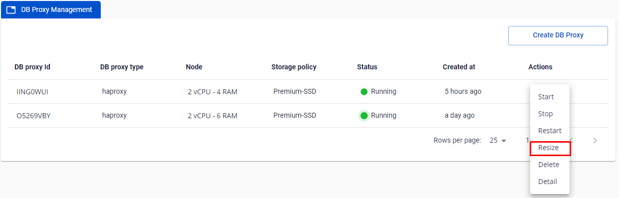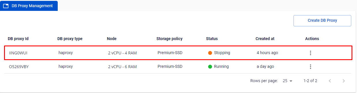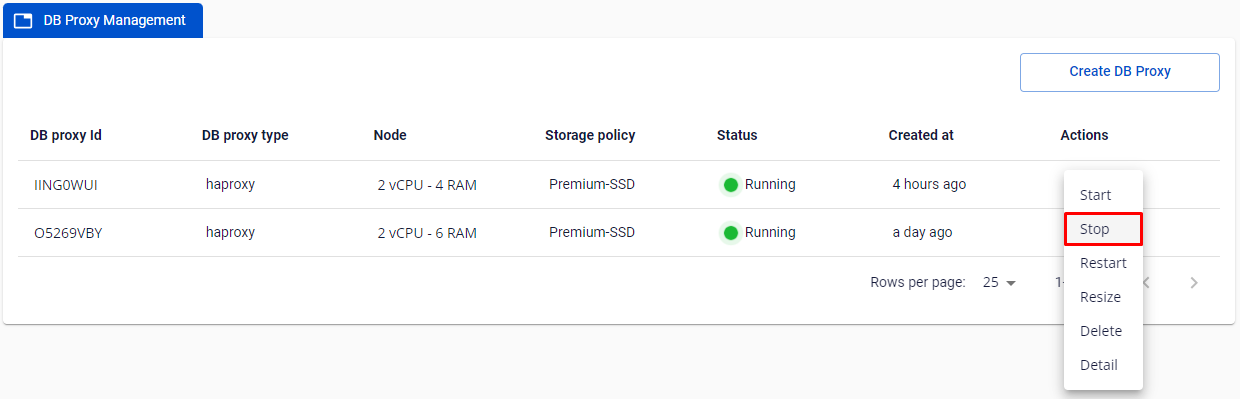 - Chọn Actions ở DB Proxy cluster ID quý khách muốn stop