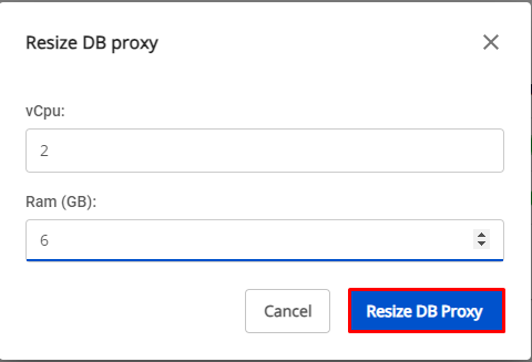 - Xuất hiện popup Resize DB Proxy , quý khách nhập thông tin vCPU và RAM, bấm Resize DB Proxy.