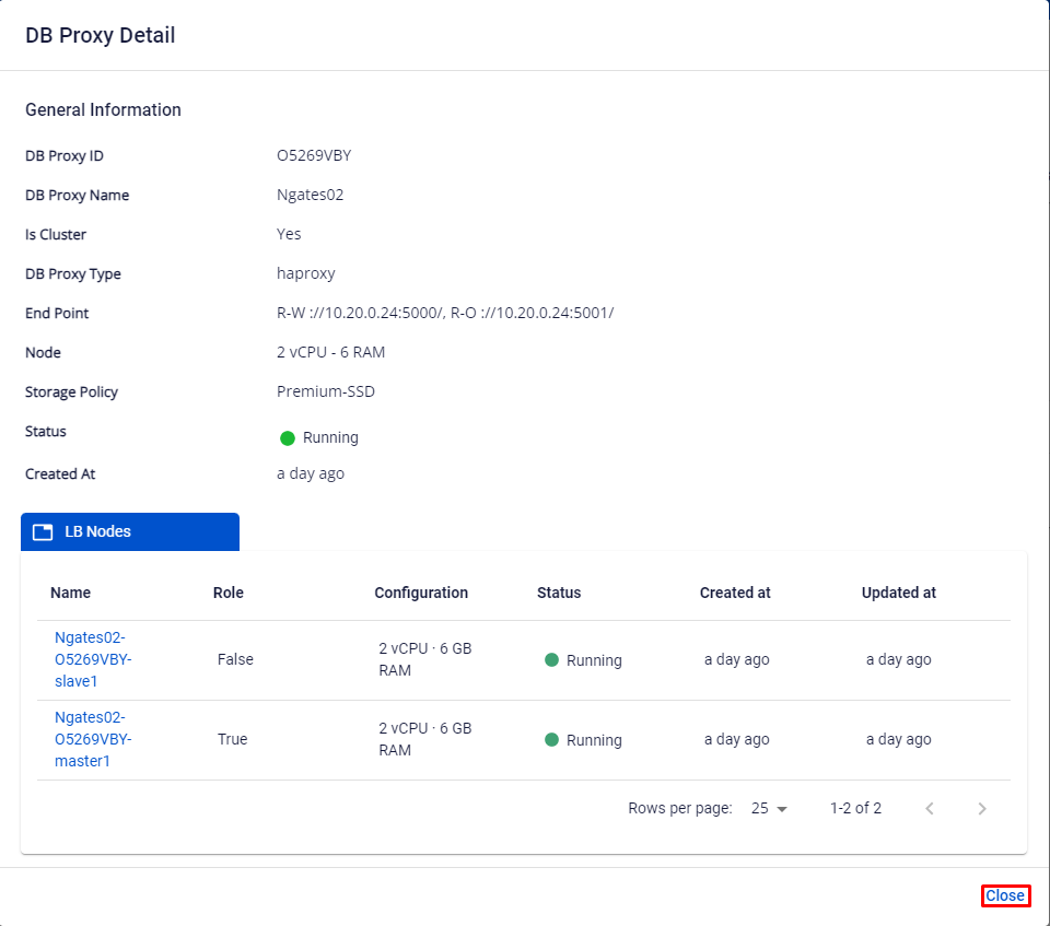 - Xuất hiện popup DB Proxy Detail , quý khách nhập lại Cluster ID để xác nhận lại, bấm Close để tắt popup