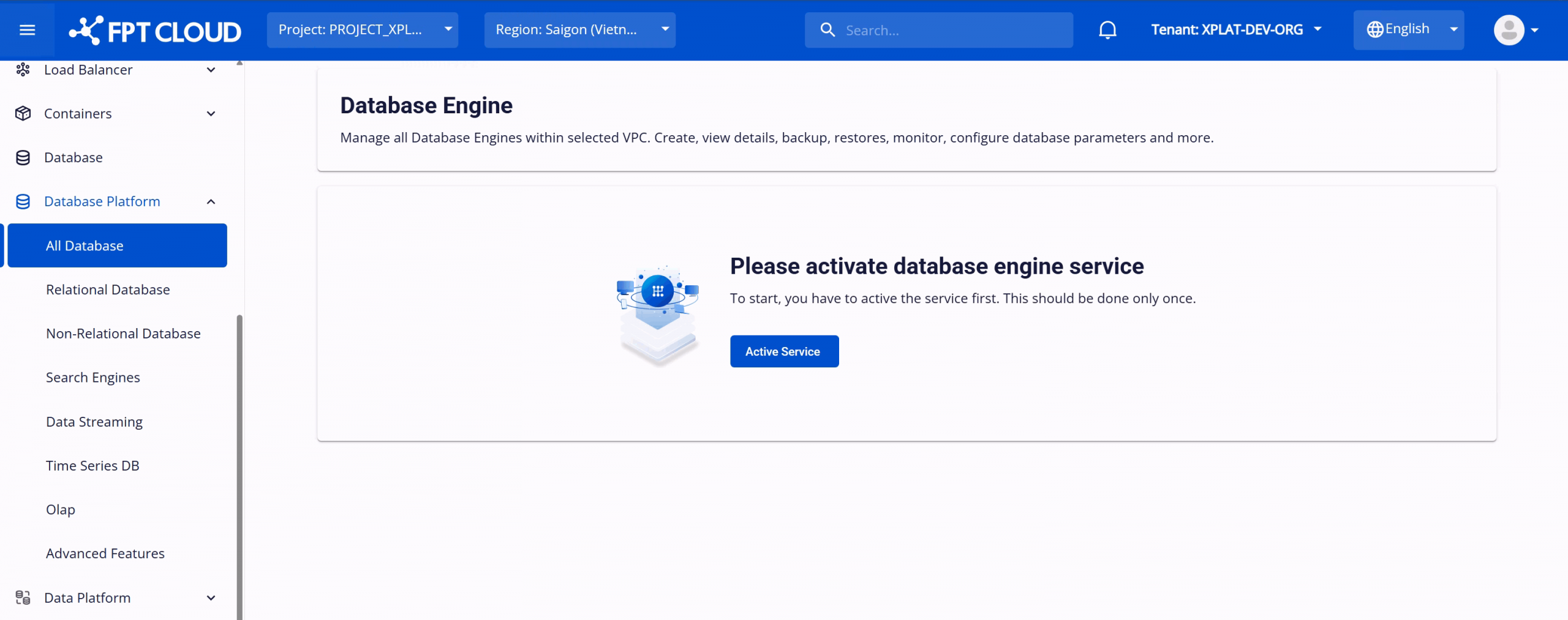 Khi dịch vụ FPT Database Engine chưa được kích hoạt, người dùng sẽ không thể tạo hoặc quản lý cơ sở dữ liệu. Việc kích hoạt dịch vụ sẽ khởi tạo các thành phần backend cần thiết, giúp FPT Database Engine sẵn sàng để sử dụng. Thao tác này chỉ cần thực hiện một lần cho mỗi VPC và theo hướng dẫn dưới đây:
