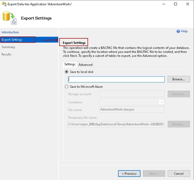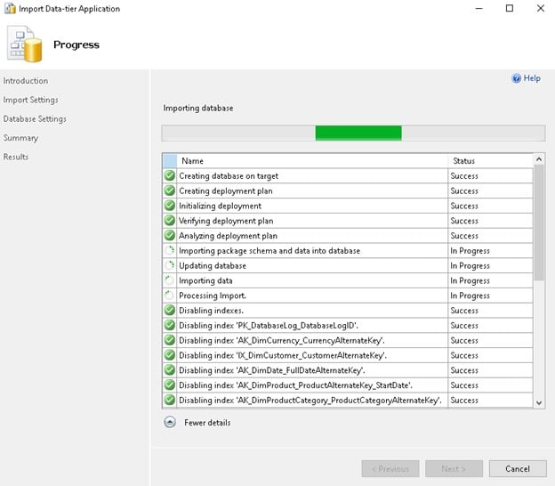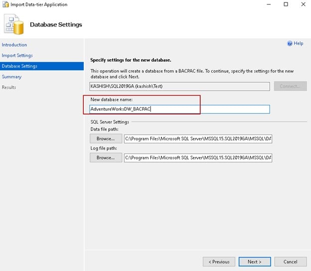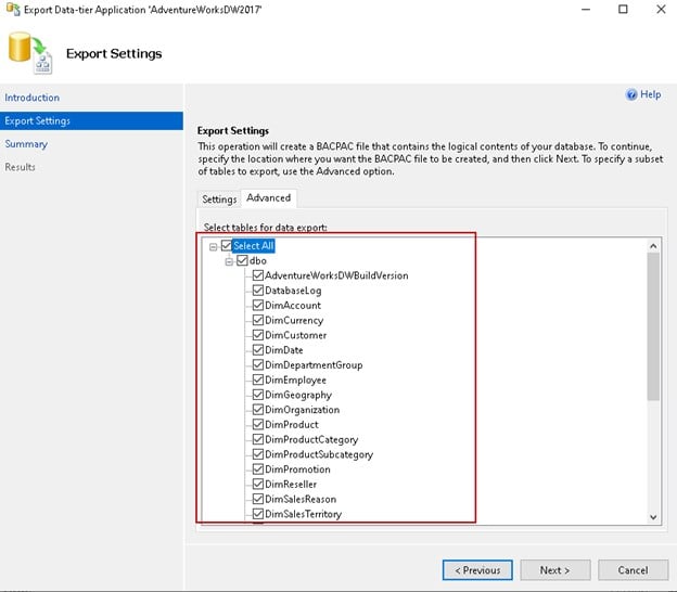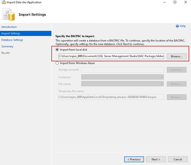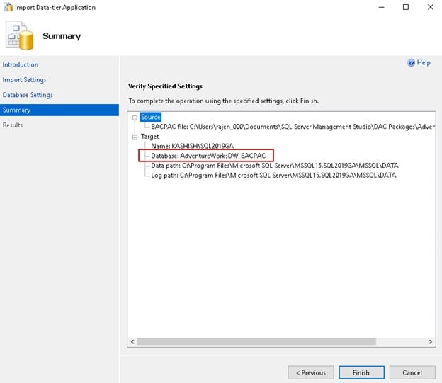 1. Export Data Tier Application via SSMS tool Connect to a SQL instance and expand databases in the object explorer. Right-click on a database in SSMS and you get data-tier application options as shown below. Right-click on the source SQL Database and click on Export Data-tier application. It launches an introduction page. This introduction page defies the summary and high-level steps for this wizard. The high-level steps are as follows: Click Let’s use a local disk directory, as shown below. By default, it extracts all schema, tables (with data) available in the database. We can also filter selected objects in the advanced page select all database schema, tables in the advanced tab of this page. Click on the advanced tab and review the objects. It groups objects per schema such as dbo. We are not using any object filtering in BACPAC export. It will create an export for all tables in the database. Click on Next and review the configurations. Click Finish , and it starts the export of the database. You can see the success message for each step. We can browse to the directory and verify a BACPAC extension file exists. 2. Import a BACPAC file using SSMS Import Data-tier Application wizard We can copy this BACPAC file to destination SQL instance having either on-premise or Azure SQL Database. Right-click on the connected destination instance and launch Import Data-tier applications wizard. Click In the next page, we specify a setting for the new database. We cannot use an existing SQL Database for importing a BACPAC package. It also requires input for the data and log file of this new database. By default, it shows you default data and log file location of connected SQL instance. We can change it per requirement. Modify the new database name. In my demonstration, I specified AdventureWorksDW_BACPAC name for SQL Database. Click The next page is a summary page showcasing your configurations. I recommend you always review it before proceeding. You can easily navigate back and make the required changes. Click Finish , and you can see the following steps. • Creates a new database • Imports schema and data into this new database • Disables indexes • Inserts data into tables • Enable indexes Refresh the object explorer, and you see the newly restored database.