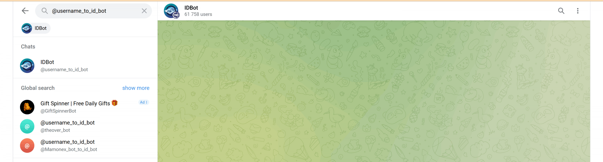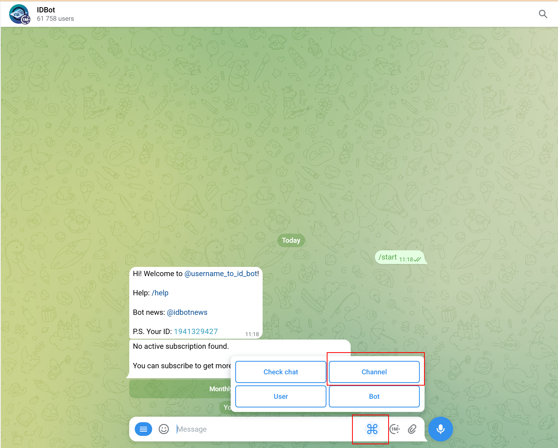 Trên ô Search nhập @username_to_id_bot để tìm mã chat IDBot: Click vào IDBot để mở cửa sổ chat. Nhấn Start để bắt đầu. Nhấn vào nút mở bảng phím tắt (Keyboard Shortcuts button) và chọn Channel : Chọn tên channel vừa mới tạo > bấm Send để gửi yêu cầu lấy thông tin ID. Telegram sẽ trả về ID của channel. Lưu lại ID này để sử dụng sau này.