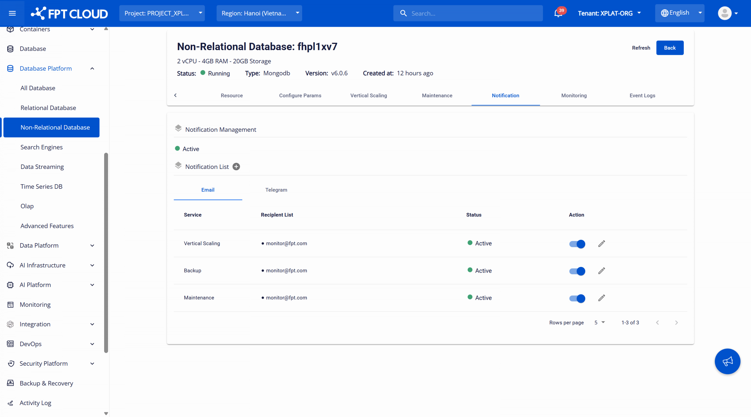 Đăng nhập vào FPT Cloud Portal. Từ menu chính, chọn “Database Platform ” → “All Database ”. Trên trang Database list, chọn Cluster ID của cụm bạn muốn cấu hình thông báo > Chọn tab “Notification ” để mở màn hình quản lý cấu hình notification.