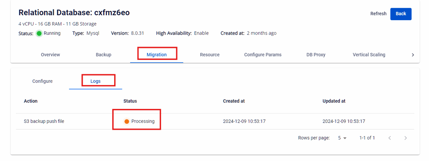 Bước 1: Truy cập màn hình Restore Từ thanh menu, chọn Database Platform > Chọn menu All Database hoặc menu tương ứng với nhóm cơ sở dữ liệu > nhấp vào Cluster ID của databse cluster cần restore > chọn tab Backup > chọn sub tab Restore. Hệ thống sẽ hiển thị danh sách các Available Restore Points , bao gồm loại backup (Full hoặc Diff). Bước 2: Thực hiện Push S3 Tại cột Actions , bấm vào biểu tượng ba chấm (⋮) tương ứng với restore point mong muốn → chọn Push S3. Hộp thoại Push S3 hiển thị danh sách các cấu hình S3 khả dụng: Chọn S3 storage mong muốn bằng cách tick vào checkbox trong cột Action rồi nhấn Push để bắt đầu quá trình đẩy file backup lên S3. Để theo dõi trạng thái của tiến trình đẩy file lên S3, truy cập tab Migration và chọn sub-tab Logs để xem thông tin chi tiết: Sau khi thao tác hoàn tất thành công, các file backup của database cluster sẽ được đẩy lên S3 storage đã chọn. Để kiểm tra kết quả, người dùng có thể truy cập S3 Browser hoặc công cụ quản lý S3 tương ứng để xác nhận các file đã được push.