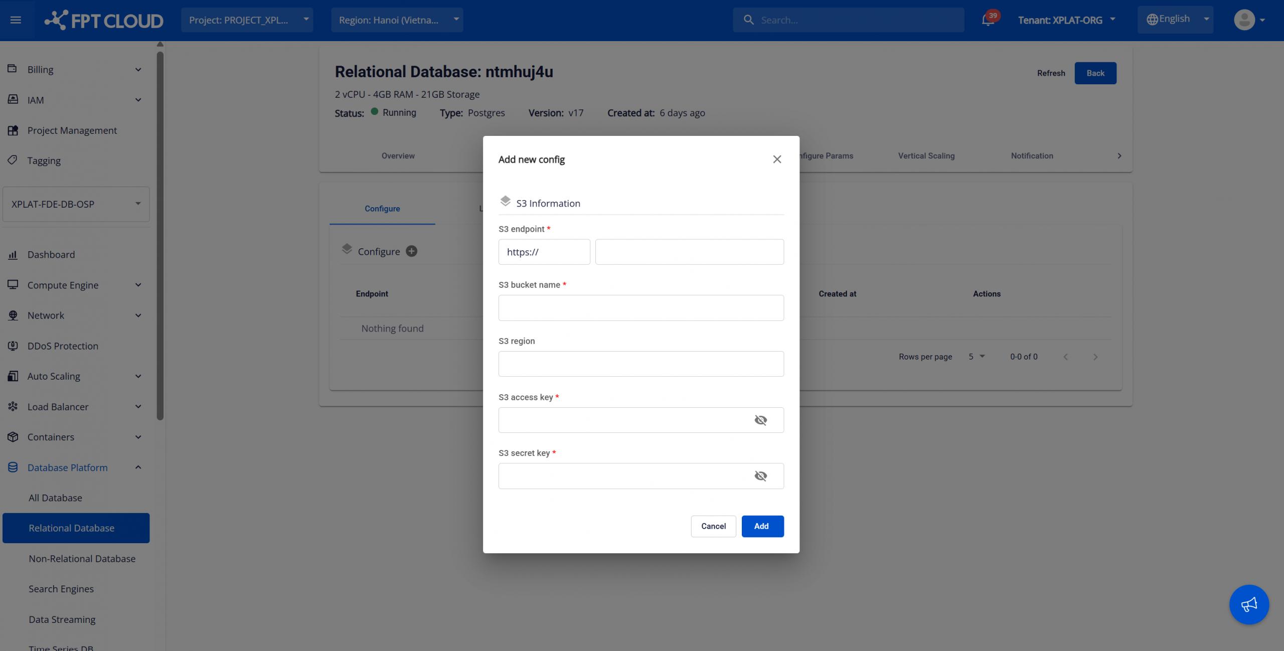 Bước 1: Truy cập trang quản lý cấu hình S3 Đăng nhập FPT Cloud Console. Mở trang Database list > chọn ID của database cluster để mở trang chi tiết > chọn tab Migration. Trang quản lý migration hiển thị như sau: Bước 2: Thêm cấu hình S3 Tại màn hình Migration , nhấn vào nút Add S3 Configuration (biểu tượng dấu cộng cạnh section "Configure ") để bắt đầu thêm cấu hình S3. Hệ thống hiển thị hộp thoại như sau: Điền thông tin cấu hình S3: