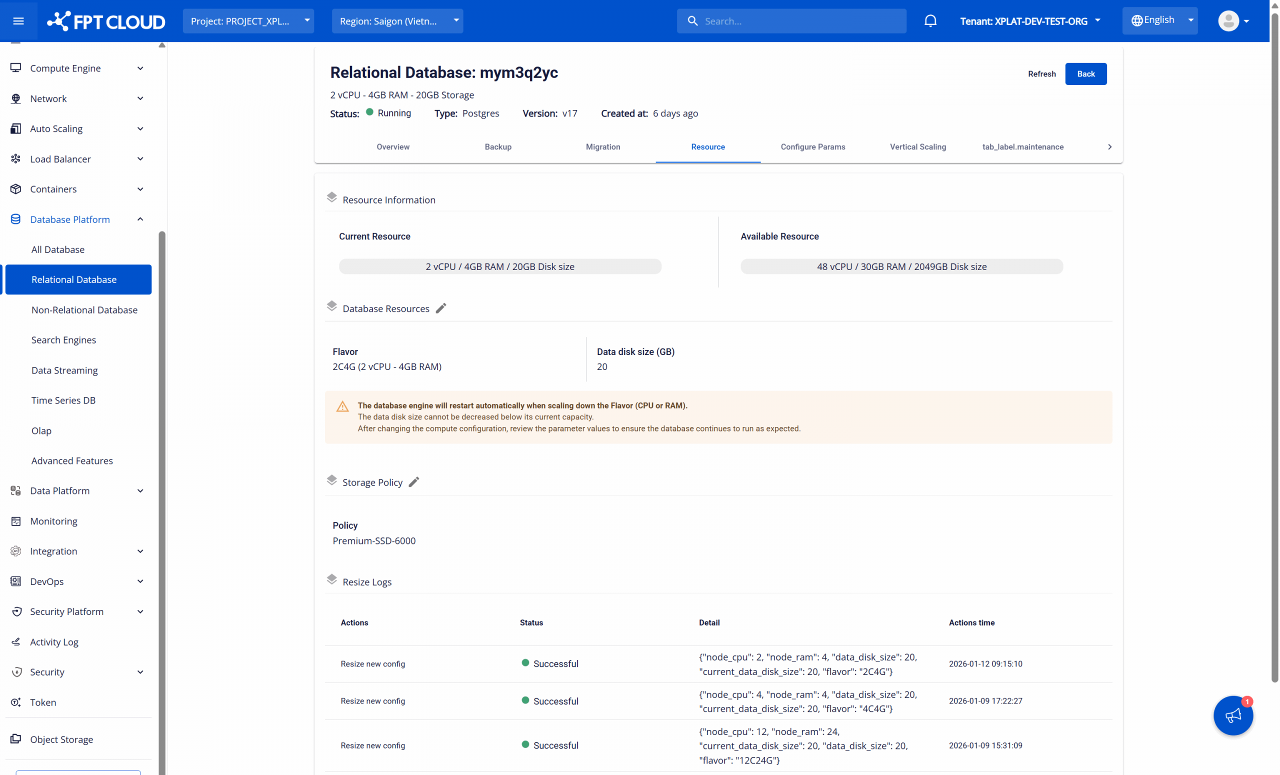 - Current Resource : Hiển thị cấu hình tài nguyên hiện tại của cơ sở dữ liệu, bao gồm vCPU, RAM và dung lượng ổ đĩa dữ liệu.