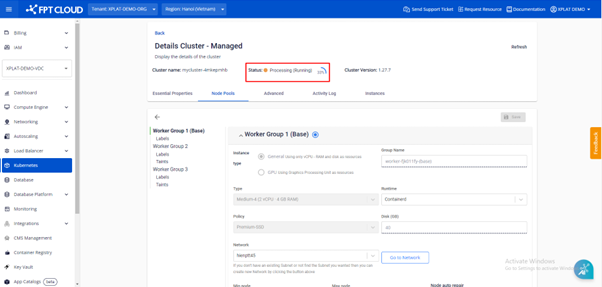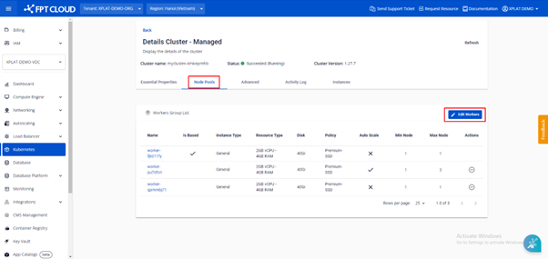 Bước 1 : Ở menu chọn Kubernetes , hệ thống sẽ hiển thị trang Kubernetes Management. Chọn Cluster muốn chỉnh sửa Label/Taint. Bước 2 : Chọn Node Pools > Edit Workers Bước 3 : Nhập LabelsTaints muốn thêm vào worker group và click button Save. Quá trình chỉnh sửa Labels và Taints sẽ thực hiện trong vòng vài phút, Status của Cluster sẽ chuyển sang Processing , trong khi thực hiện người sử dụng không thể thao tác chỉnh sửa Cluster cho đến khi quá trình hoàn tất.