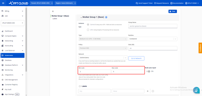 Bước 3 : Điều chỉnh số lượng worker min-max theo sizing mà người dùng lựa chọn.