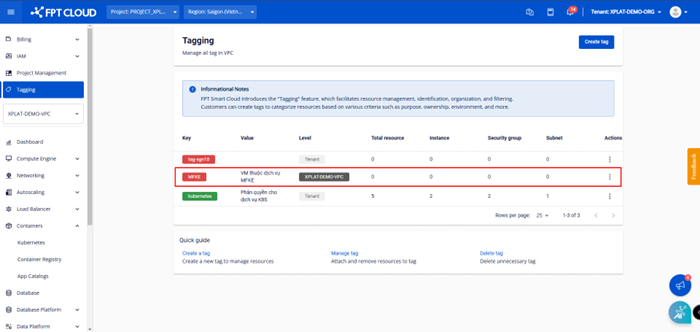 Tính năng Tagging cho phép người dùng gắn nhãn các máy ảo bằng những thẻ tùy chỉnh (tags) nhằm mục đích phân loại, tìm kiếm và quản lý tài nguyên hiệu quả hơn. ✓ Phân loại thông minh : Dễ dàng tổ chức các máy ảo theo môi trường (Production, Staging, Development), dự án, phòng ban hoặc bất kỳ tiêu chí nào phù hợp với quy trình quản lý. ✓ Tìm kiếm nhanh chóng : Dựa trên các thẻ được gắn, người dùng có thể lọc và tìm kiếm VM một cách dễ dàng mà không cần ghi nhớ tên phức tạp. ✓ Quản lý hiệu quả : Hỗ trợ theo dõi chi phí, sử dụng tài nguyên và thực hiện báo cáo dựa trên từng nhóm VM đã được đánh tag. ✓ Tùy chỉnh linh hoạt : Thẻ (tags) có thể được tùy chỉnh và áp dụng cho nhiều mục đích khác nhau, phù hợp với nhu cầu cụ thể của doanh nghiệp. Với tính năng Tagging, việc quản lý hạ tầng ảo hóa trở nên khoa học hơn, tiết kiệm thời gian và nâng cao hiệu suất vận hành hệ thống. Bạn có thể thao tác các tính năng Tagging trên Portal như sau: Tạo Tagging Để có thể đánh tag cho VM nằm trong worker group MFKE, người dùng cần phải tạo trước tag theo đúng mục đích sử dụng. Bước 1 : Trên Unify Portal , chọn Tagging → chọn Create tag Bước 2 : Nhập các thông tin của tag và nhấn button Create.