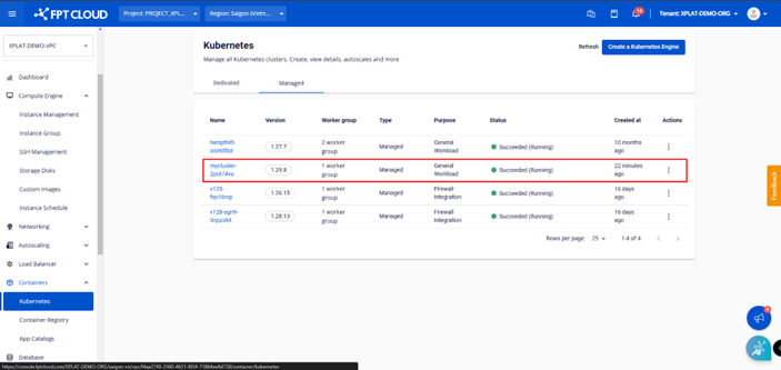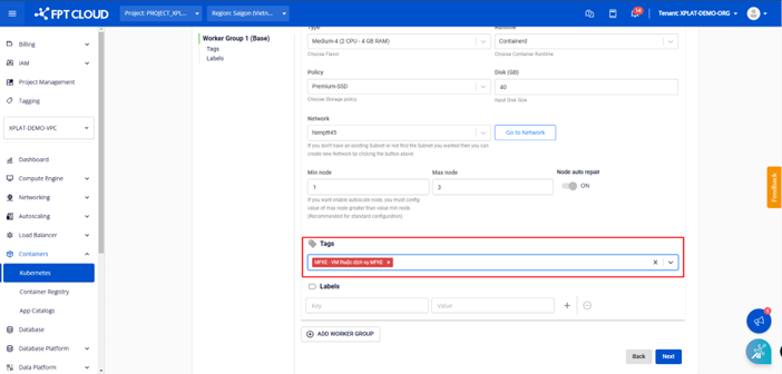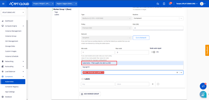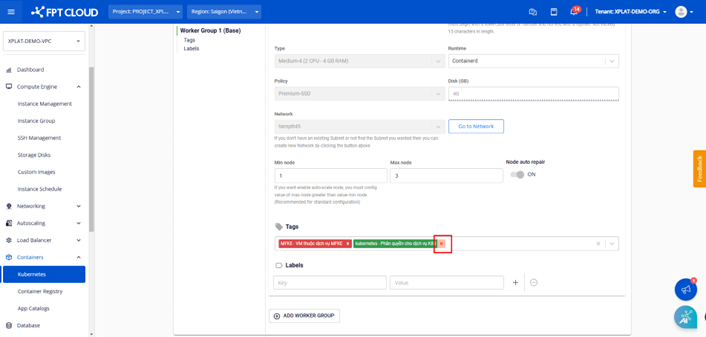 Gắn Tag để sử dụng worker group thuộc MFKE Đối với tạo cụm cluster mới Bước 1 : Trên Unify Portal , chọn Kubernetes → Chọn Managed → Chọn Create a Kubernetes Engine để tạo cluster mới. Bước 2 : Tại mục Nodes Pool , chọn Tag muốn sử dụng cho worker group. Nhập đầy đủ các thông tin cần thiết cho cụm cluster và nhấn button Create a Kubernetes. Chỉnh sửa Tag cho worker group Bước 1 : Ở menu chọn Kubernetes , hệ thống sẽ hiển thị trang Kubernetes Management. Chọn Cluster muốn chỉnh sửa Tag. Bước 2 : Chọn Node Pools > Edit Workers Bước 3 : Add thêm Tag vào worker group và click button Save. Quá trình chỉnh sửa Tag sẽ thực hiện trong vòng vài phút, Status của Cluster sẽ chuyển sang Processing , trong khi thực hiện người sử dụng không thể thao tác chỉnh sửa Cluster cho đến khi quá trình hoàn tất. Xóa Tag ra khỏi worker group Bước 1 : Chọn Node Pools > Edit Workers Bước 2 : Click dấu để xóa tag khỏi worker group, sau đó nhấn Save. Quá trình xóa Tag sẽ thực hiện trong vòng vài phút, Status của Cluster sẽ chuyển sang Processing , trong khi thực hiện người sử dụng không thể thao tác chỉnh sửa Cluster cho đến khi quá trình hoàn tất.
